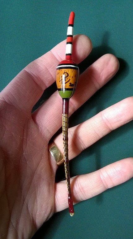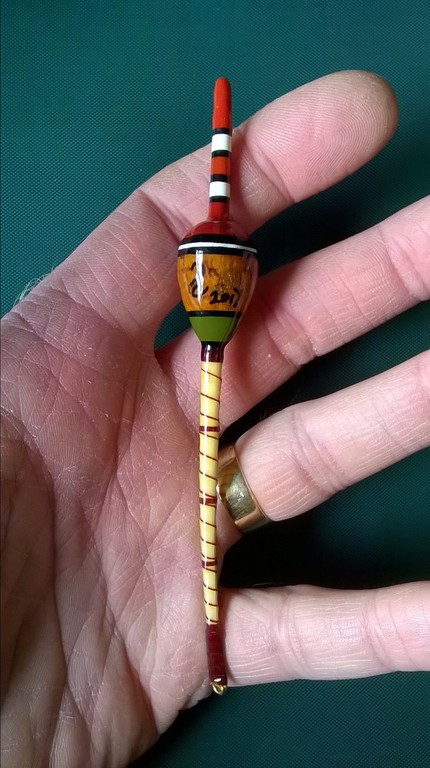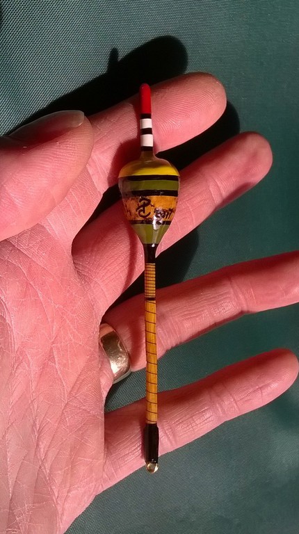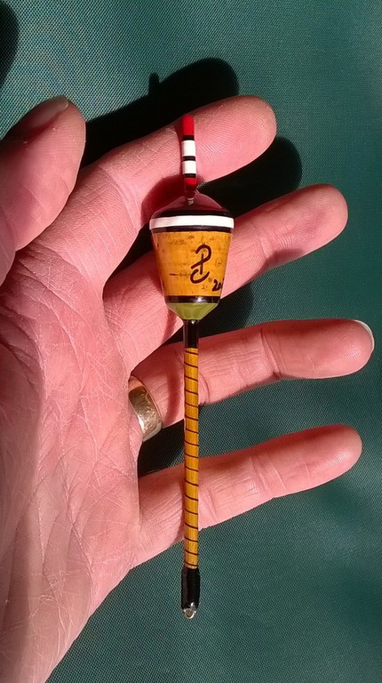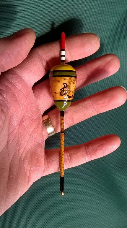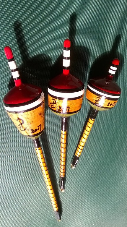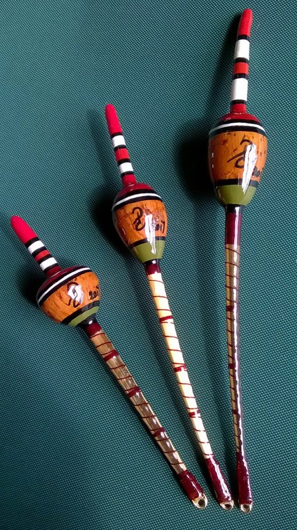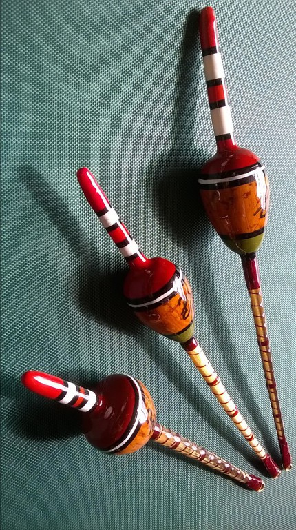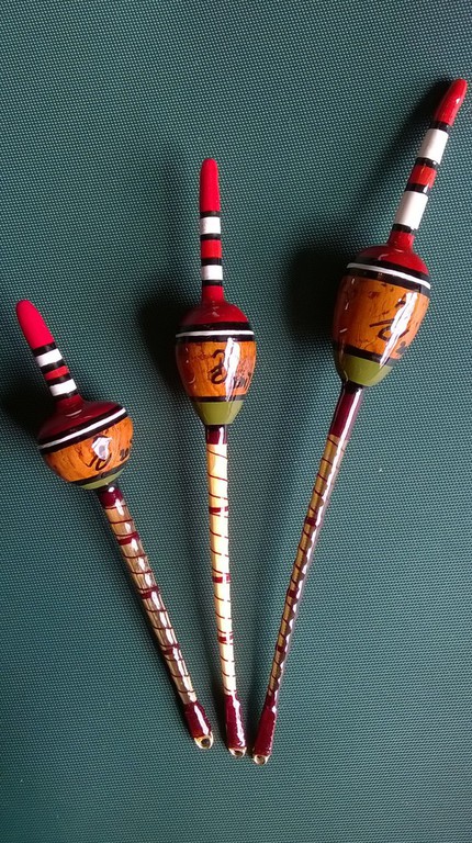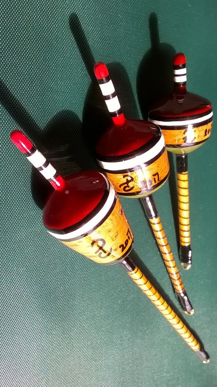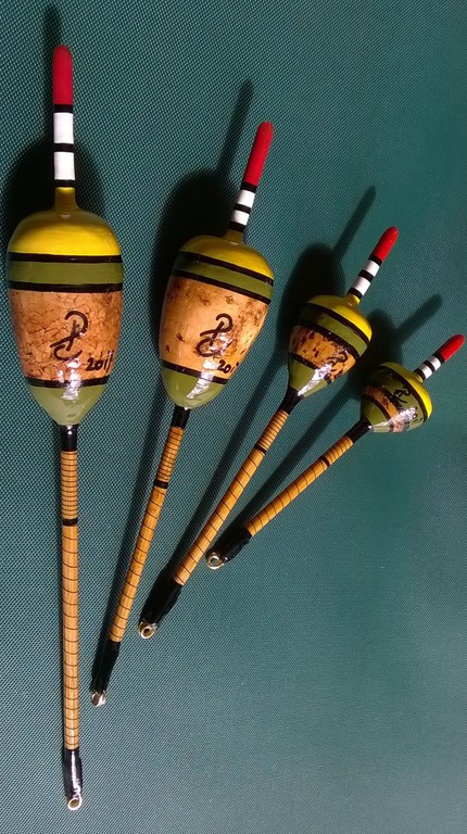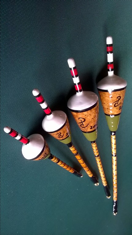 These perch floats have hand turned cork bodies set on stems of either bamboo cane or Muscovy