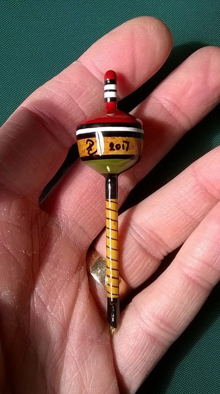 Hand coiled brass wire line eyes are whipped to the base of each float stem with fine black or scarlet silk thread.