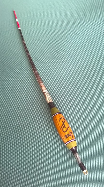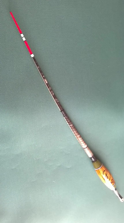 The Minnow antenna has a turned balsa body set on a sturdy split cane tonkin bamboo stem. It has a hand coiled brass wire line eye